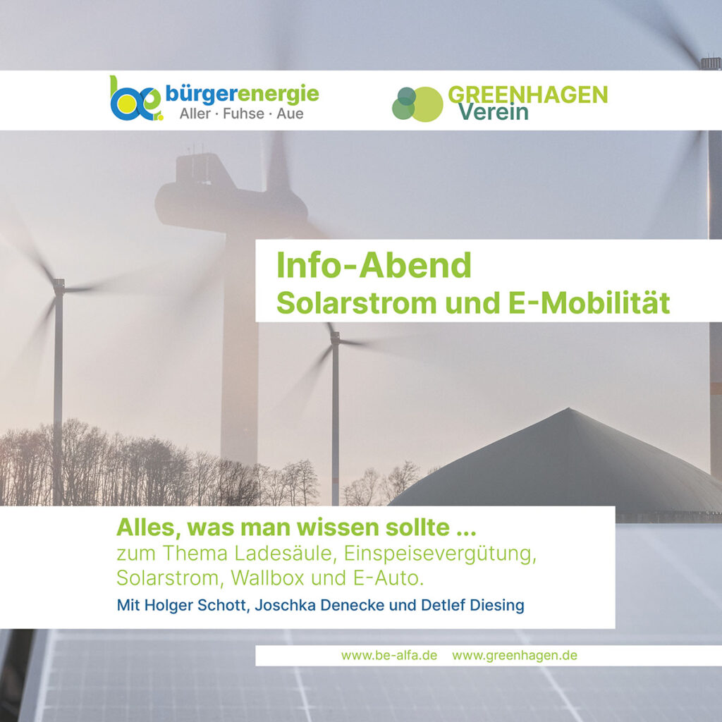 Die Teilnahme ist kostenlos. Veranstalter: Bürgerenergie Aller – Fuhse – Aue eG in Zusammenarbeit mit Greenhagen e.V.